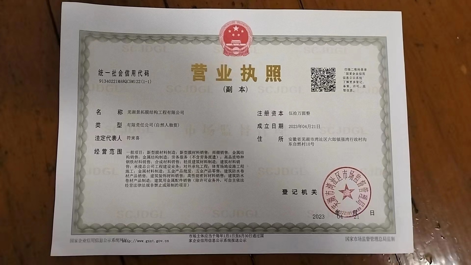 蕪湖景拓膜結(jié)構(gòu)工程有限公司是主要從事膜結(jié)構(gòu)汽車棚、膜結(jié)構(gòu)電動(dòng)車棚、膜結(jié)構(gòu)景觀棚、膜結(jié)構(gòu)屋頂、膜結(jié)構(gòu)出入口、膜結(jié)構(gòu)看臺(tái)和推拉棚的設(shè)計(jì)、生產(chǎn)、銷售、采用工廠化精密加工,現(xiàn)場(chǎng)組裝安裝模式。本公司將不斷研發(fā)、引進(jìn)各類新款,以滿足廣大客戶不同的需求。公司擁有多名專業(yè)的設(shè)計(jì)師不斷的更新產(chǎn)品款式、設(shè)計(jì)出更高質(zhì)量的產(chǎn)品。
